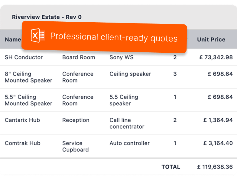 Produce client-ready estimates in Excel with a full breakdown of quantities and costs to suit any client request.